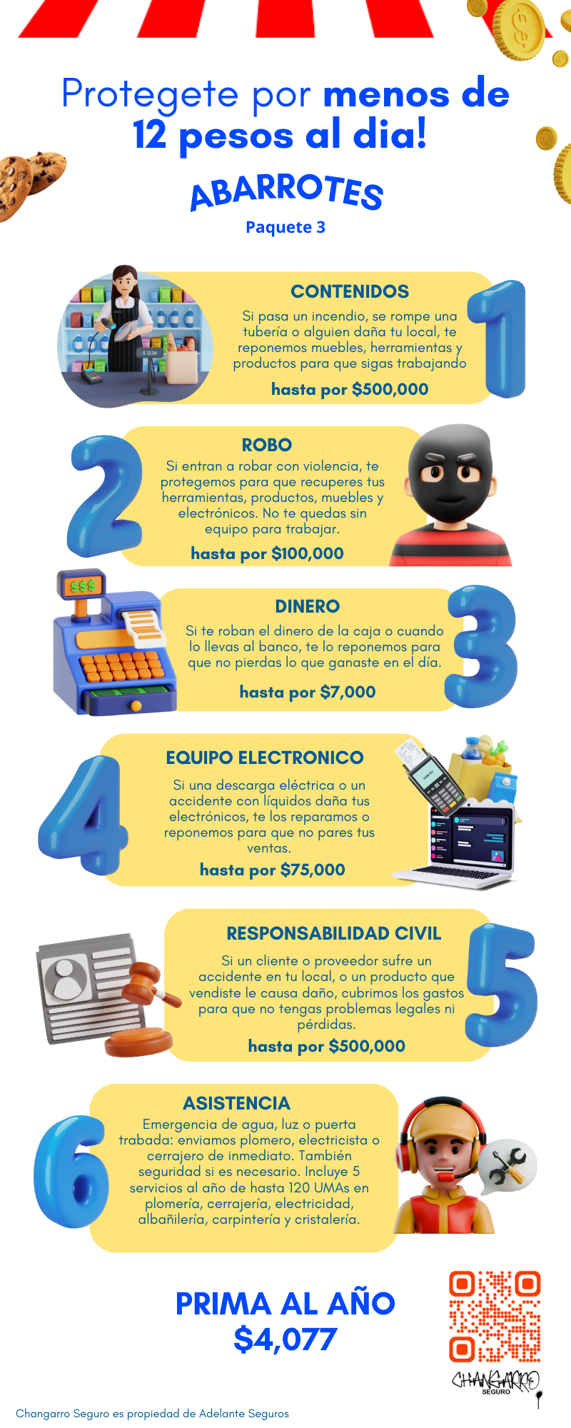 Te protege si entran a tu tienda y roban inventario o equipo. Aplica siempre que exista violencia y se levante el acta correspondiente.